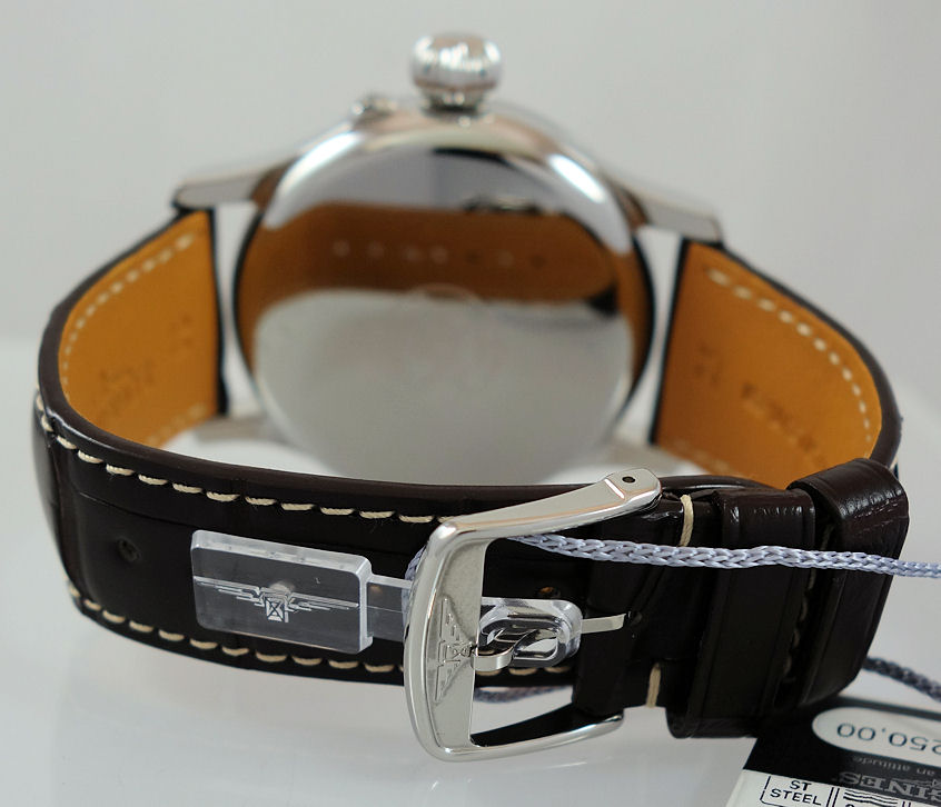 | Band | Brown Alligator leather with white stitching and steel pin buckle. |