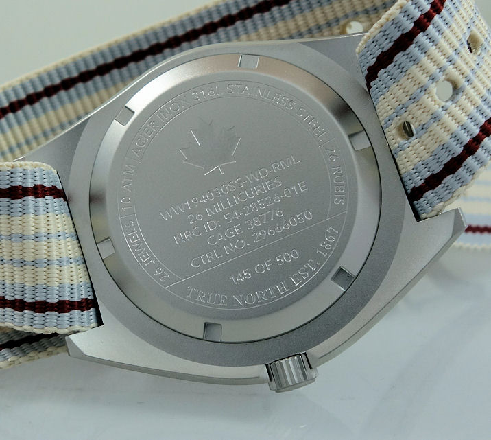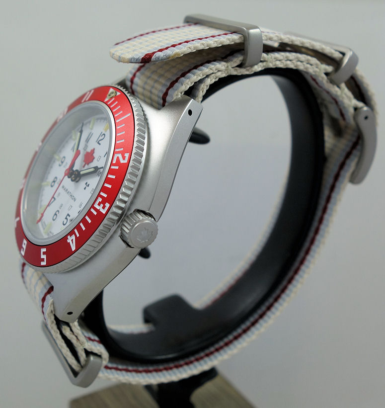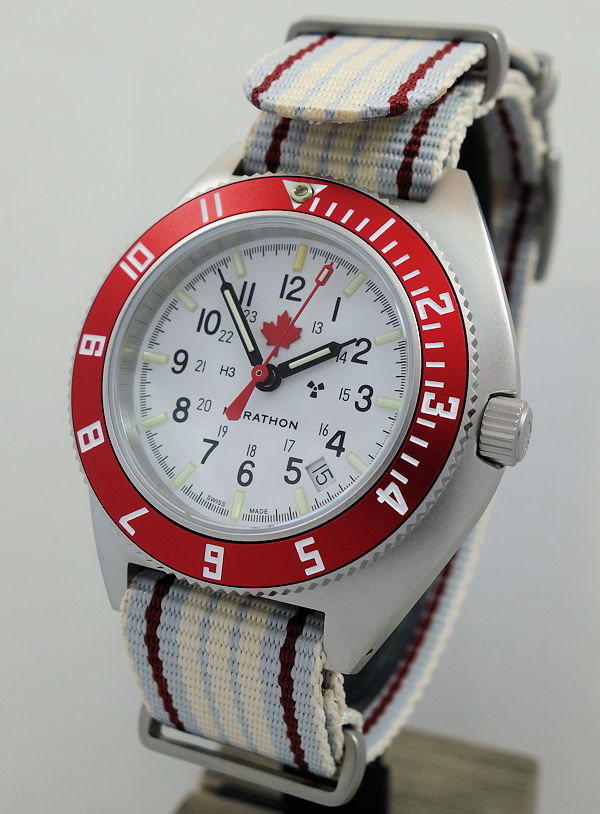 | Dial | Arctic white with red maple leaf below 12, black Arabic (12 & 24) numbers, luminous hours & hands. Date between 4/5 o’clock. |