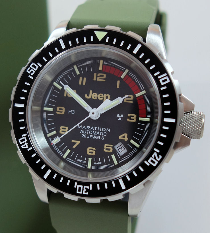 | Dial | Matte-Black Dial, Arabic hours, MaraGlo™ and Tritium Gas Tubes, Jeep Logo on Dial & date between 4/5 h pos. |