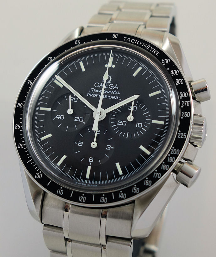 This Speedmaster Professional Apollo 11 ref. 3560.50 (or ST 345.0223) was introduced in 1999 for the 30th anniversary of the Apollo 11 mission in 1969.  The case back is engraved with the famous line from Neil Armstrong when they landed on the Moon: “Hello Houston, Tranquility Base here, the Eagle has landed”.  The engraving also included the limited edition number (4654/9999 pieces) and the date; commemorating the moon-landing on the 21st of July 1969, at 2:56 GMT.