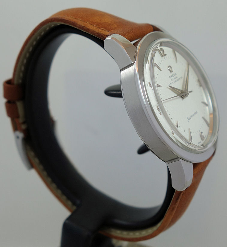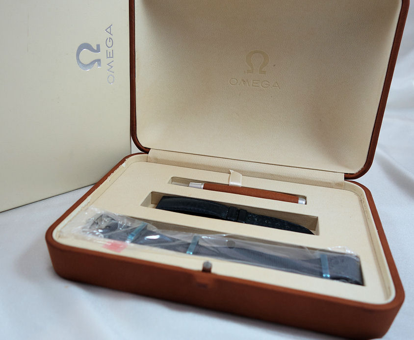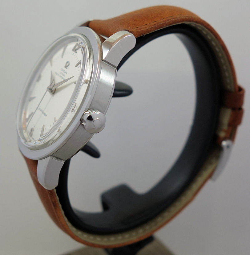 The 38mm stainless steel case houses an opaline silvery domed dial with Dauphine style hour/minute hands, central second hand, indexes and a vintage OMEGA logo all in 18K white gold.