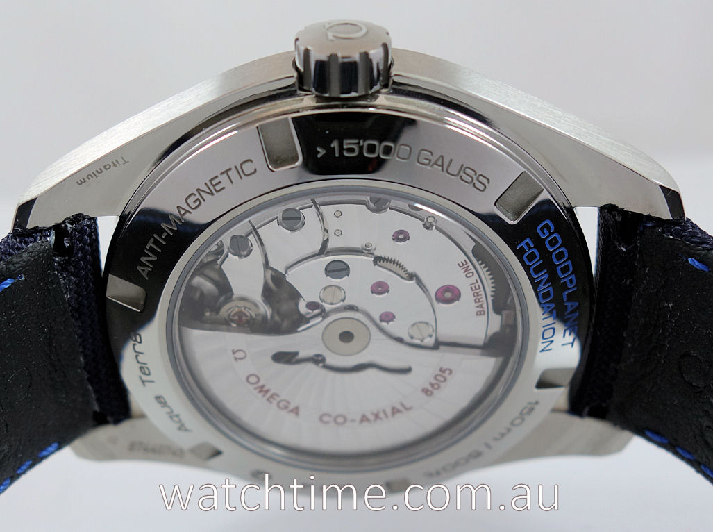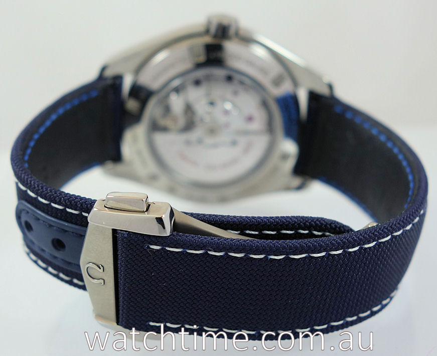 The 43 mm grade 5 titanium case is presented on blue coated nylon fabric strap. This timepiece is powered by the OMEGA Master Co-Axial calibre 8605.