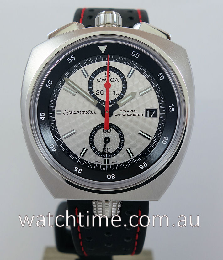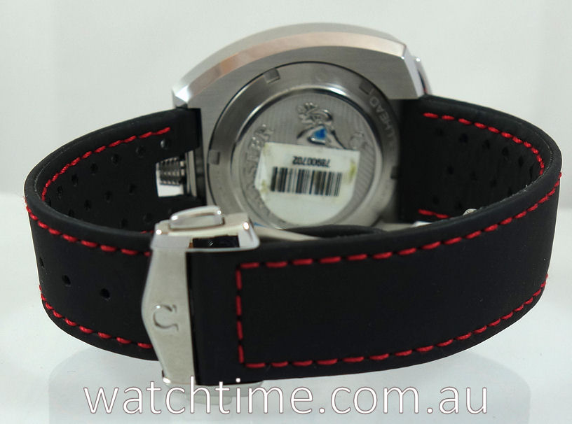 As with the original Bullhead, there is a date window at 3 o’clock. The silvery “rallye” dial features a stippling pattern and is visible through a sapphire crystal with anti-reflective treatment on both sides. The screw-in caseback is stamped with the familiar polished Seamaster Seahorse. Its black bi-directional rotating inner bezel has a 60-minute scale.