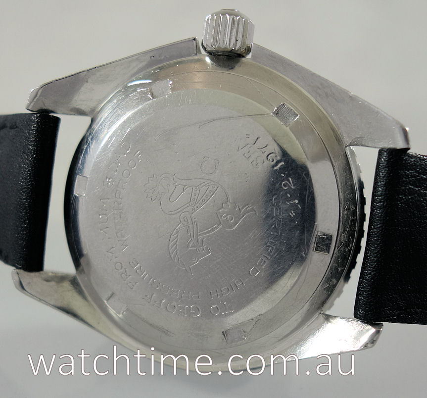 | Case | Stainless-steel screw-back case with the Seahorse emblem on the back. New crown. Original bi-directional rotating bakelite bezel and plexiglas. |