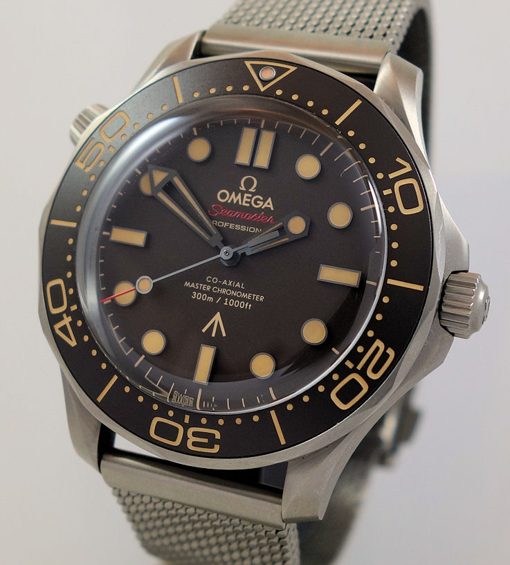 Identical to 007’s watch in No Time To Die this 42mm Seamaster, in strong yet lightweight Grade 2 Titanium, sports a brown tropical aluminium bezel ring and dial.
