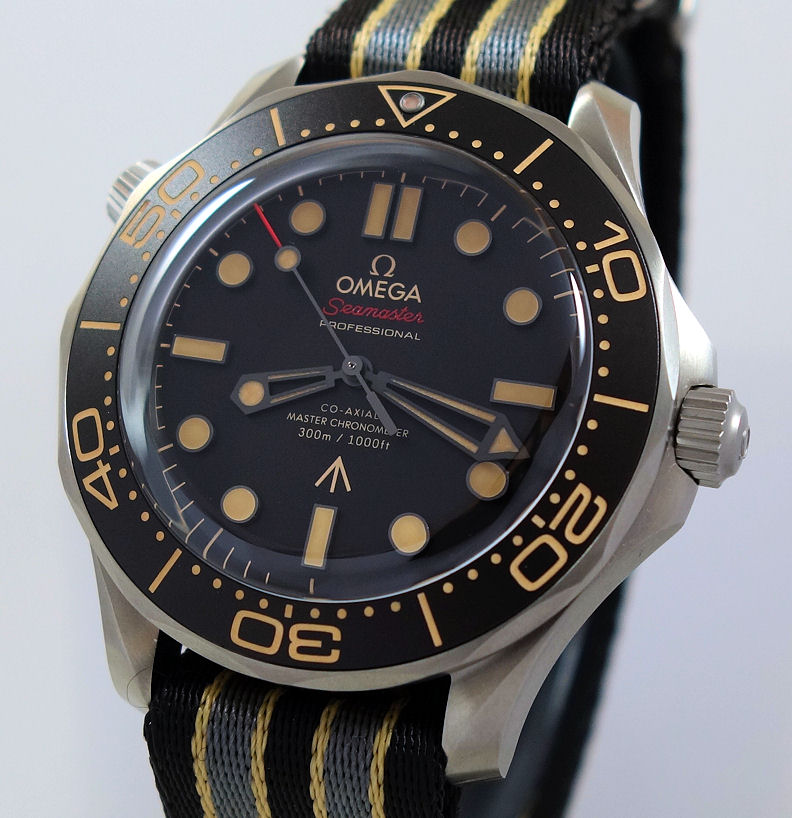 Identical to 007’s watch in No Time To Die this 42mm Seamaster, in strong yet lightweight Grade 2 Titanium, sports a brown tropical aluminium bezel ring and dial.