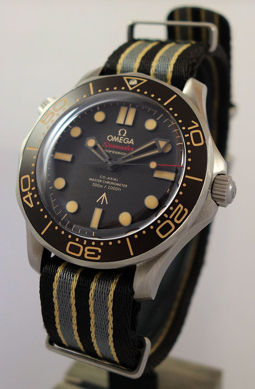 Slightly slimmer than the standard Diver 300M models thanks to the doming of the sapphire-crystal glass, it is presented on NATO strap in brown, grey and beige with 007 engraved on a titanium loop.