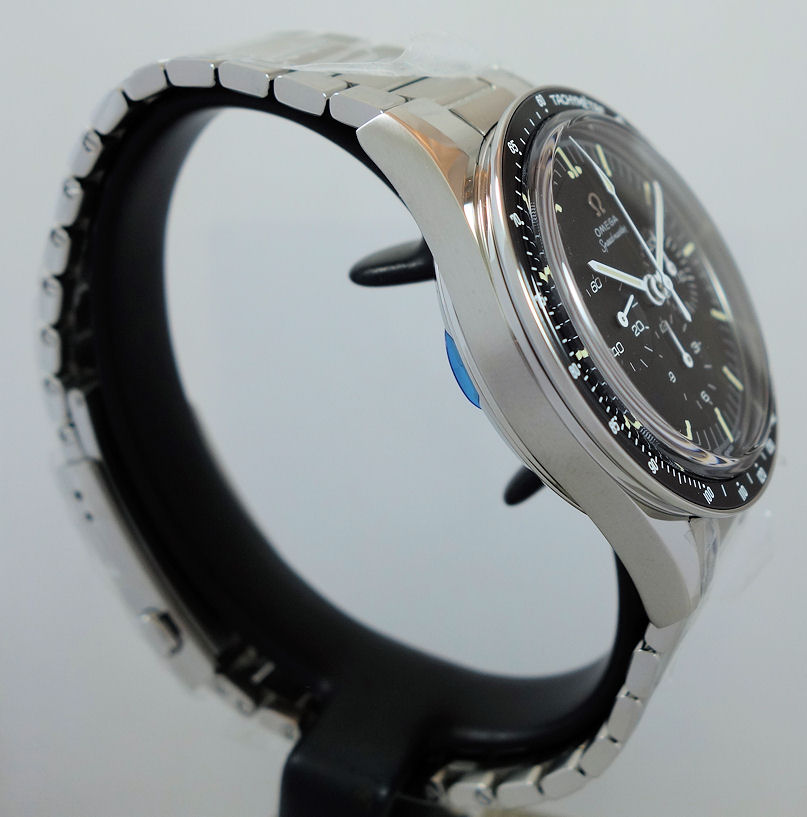Black step dial with Moonwatch hands and vintage OMEGA logo. Luminous hour indexes and lume-filled hands.