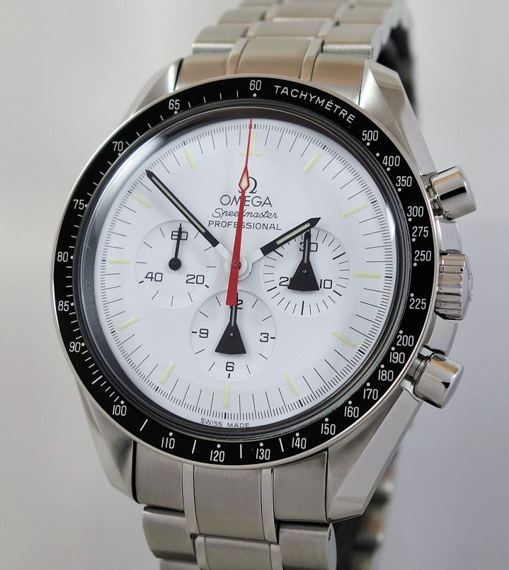 | Dial | White with luminous hour indexes, black baton hands with luminous fill. Red central chrono hand and “rocket” hands in the chrono subdials. |