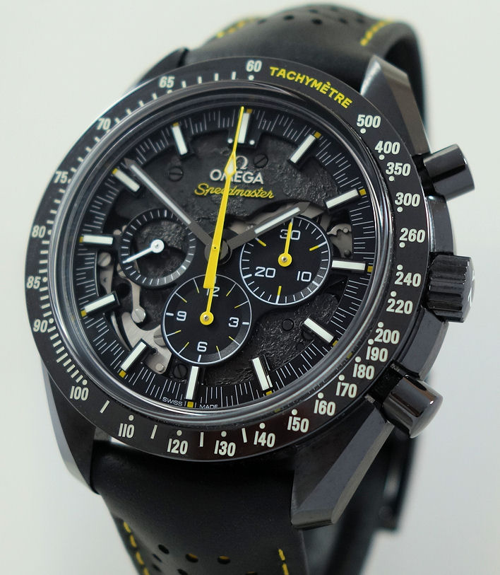 | Dial | Black; laser-ablated to simulate the moon’s surface with luminous hands / hour indexes and yellow accents. |
