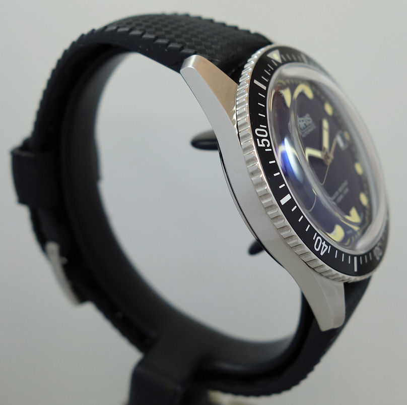 | Dial | Black dial with “old radium” Superluminova coating on the indices and hands. Arabic numerals mark the 3, 6, 9 and 12 o’clock positions. Date window above 6 h pos. |