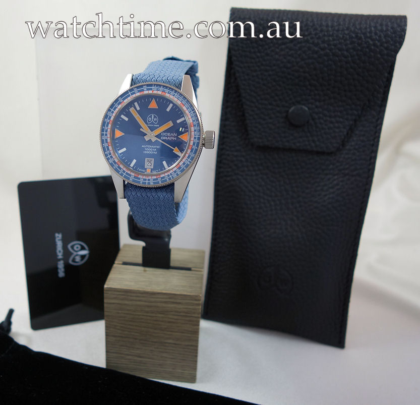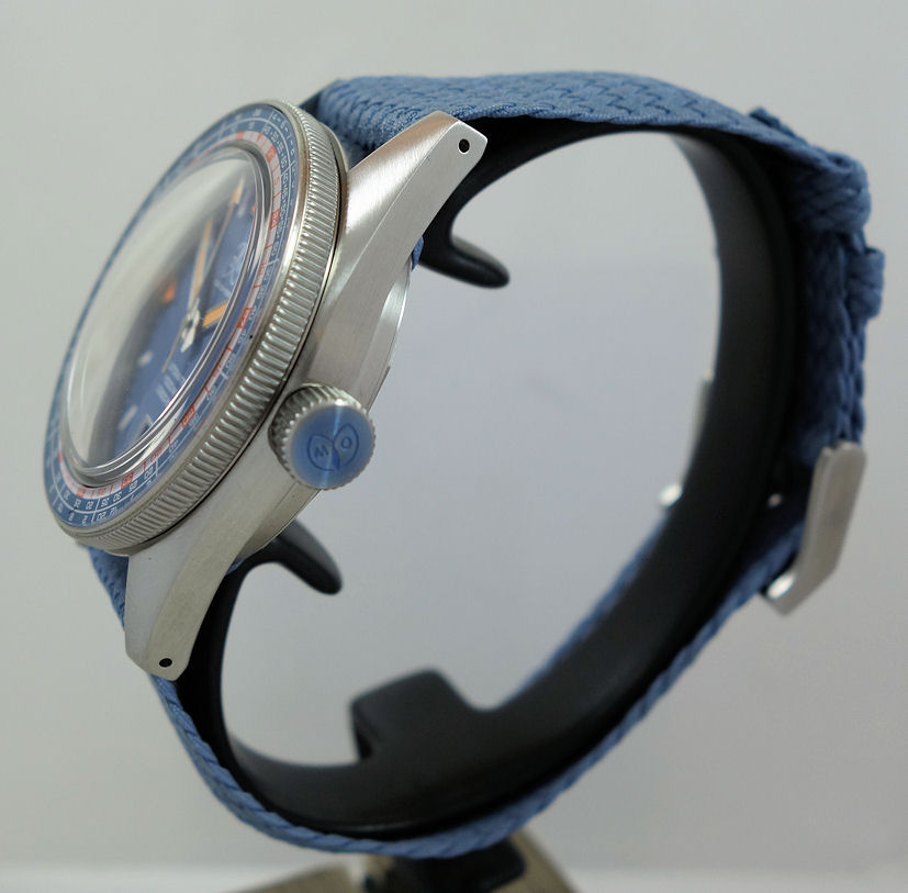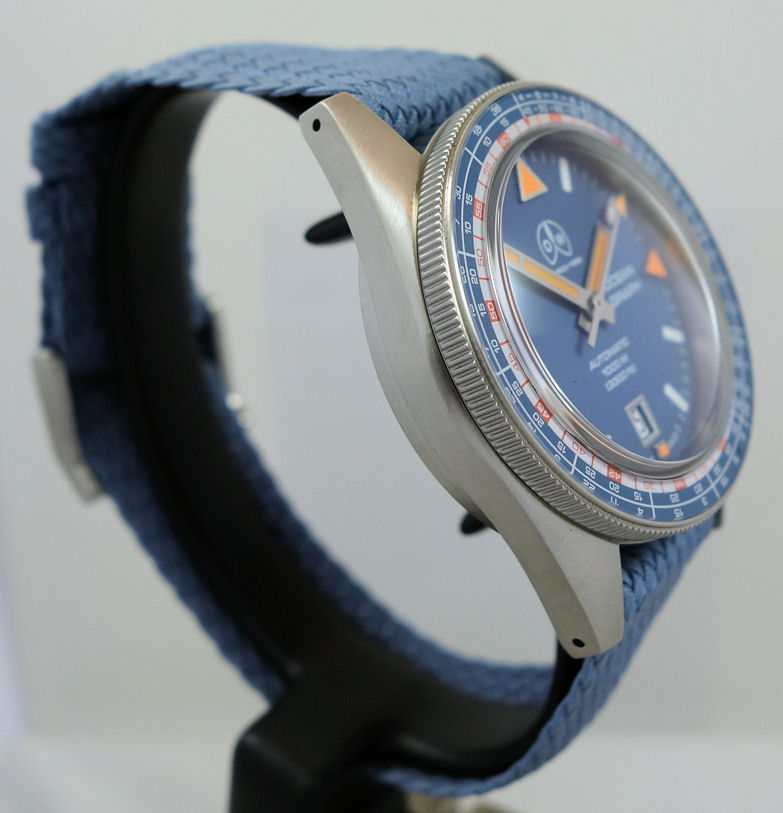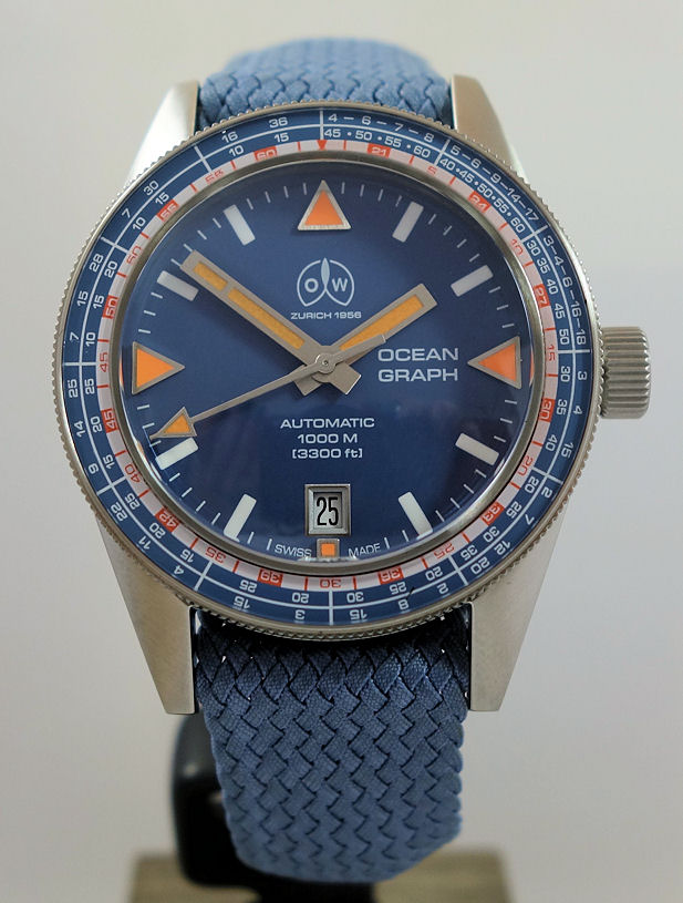 | Dial | Blue with SuperLuminova hour indexes and hands (orange in the triangles & arrow head). Date at 6 o’clock. |