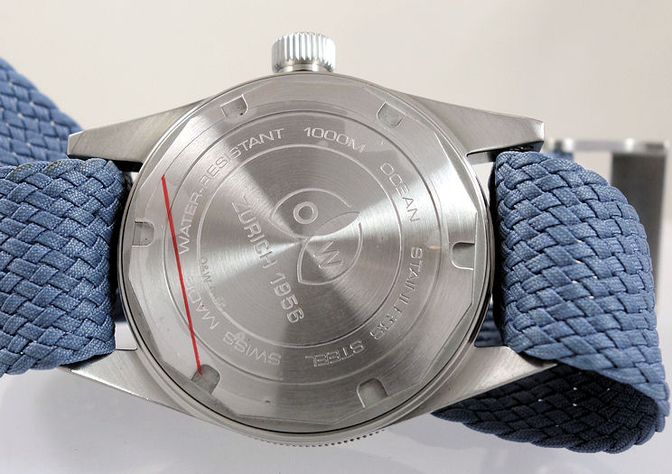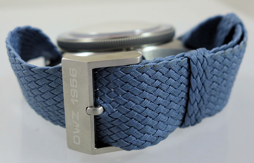 | Band | Blue Perlon RAF woven fabric strap with steel pin buckle. |