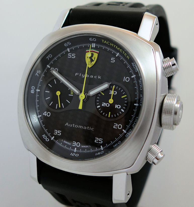 Carbon-fibre dial with luminous hours/hands,  yellow accents and Ferrari’s prancing horse badge at 12 o’clock.