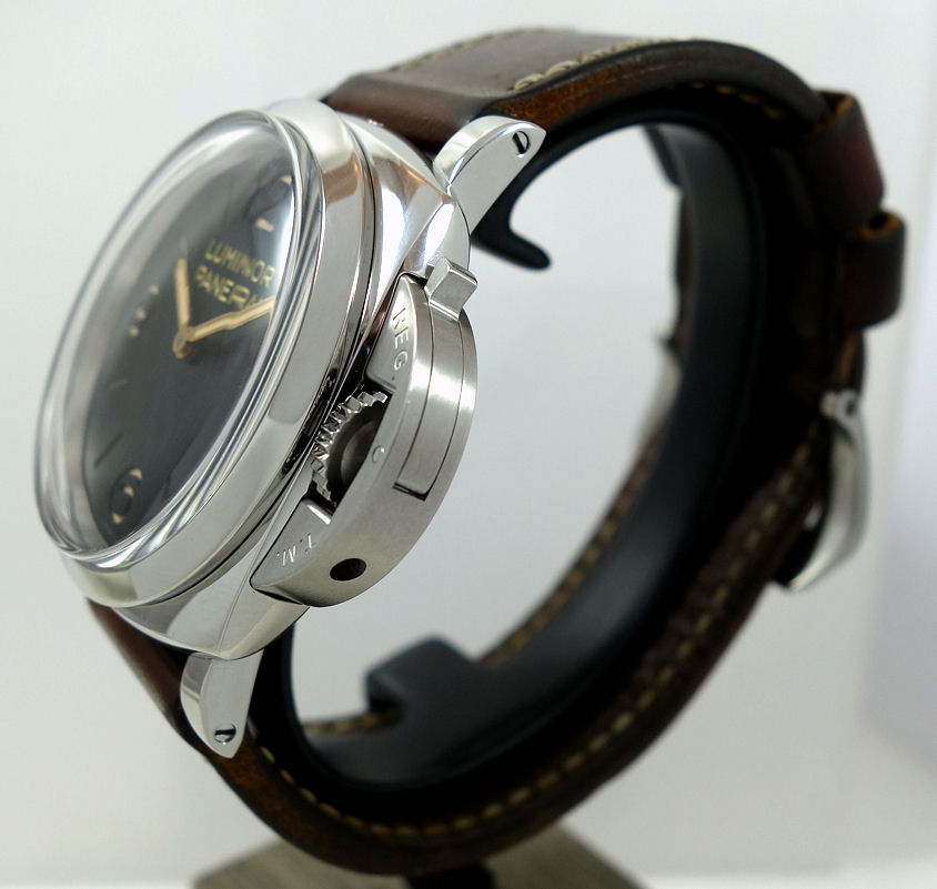 Polished Stainless-steel 1950s Luminor case with crown protection device, domed Plexiglas crystal and display Sapphire case-back.