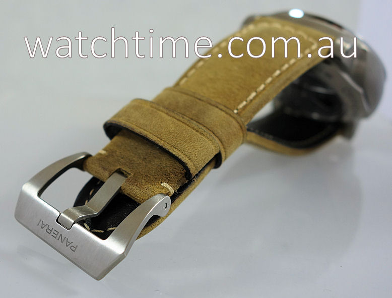 | Band | Sand Calf Assolutamente with contrasting white stitch and pin buckle by Panerai. Additional Black Rubber by Panerai. |