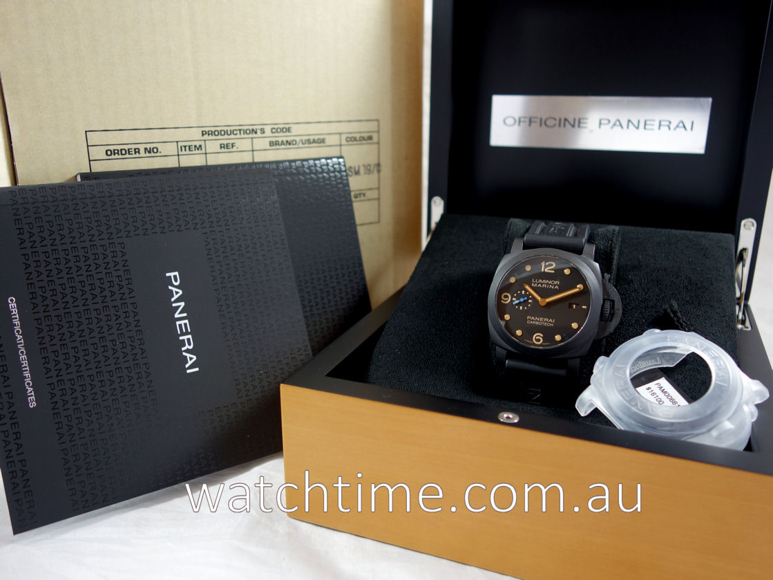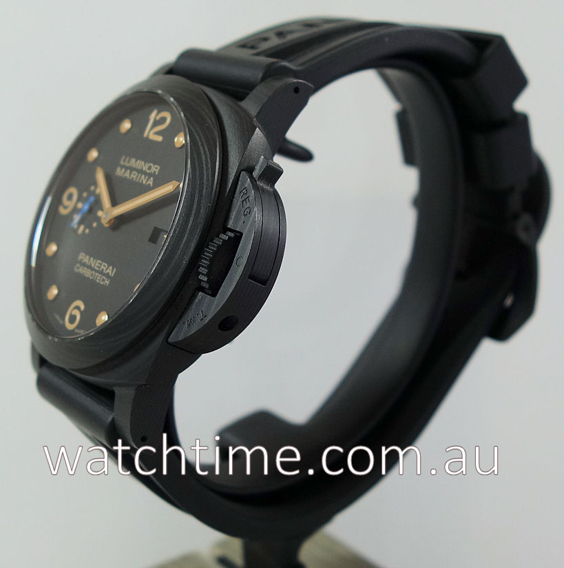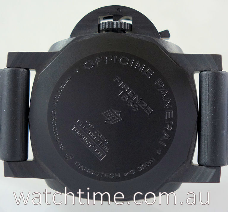| Case | 1950s Luminor Black Carbon case with solid case-back and crown locking device. Sapphire crystal glass. |
