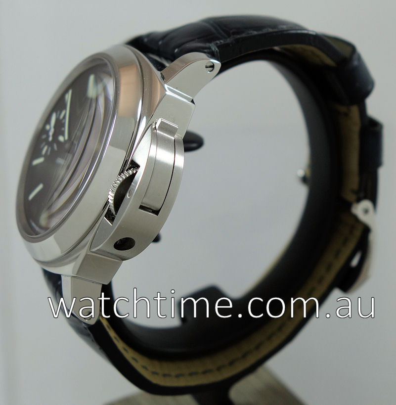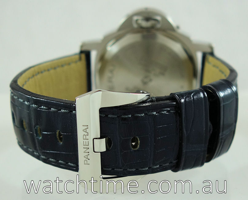 | Band | Navy-Blue Alligator leather and steel pin buckle by Panerai. |