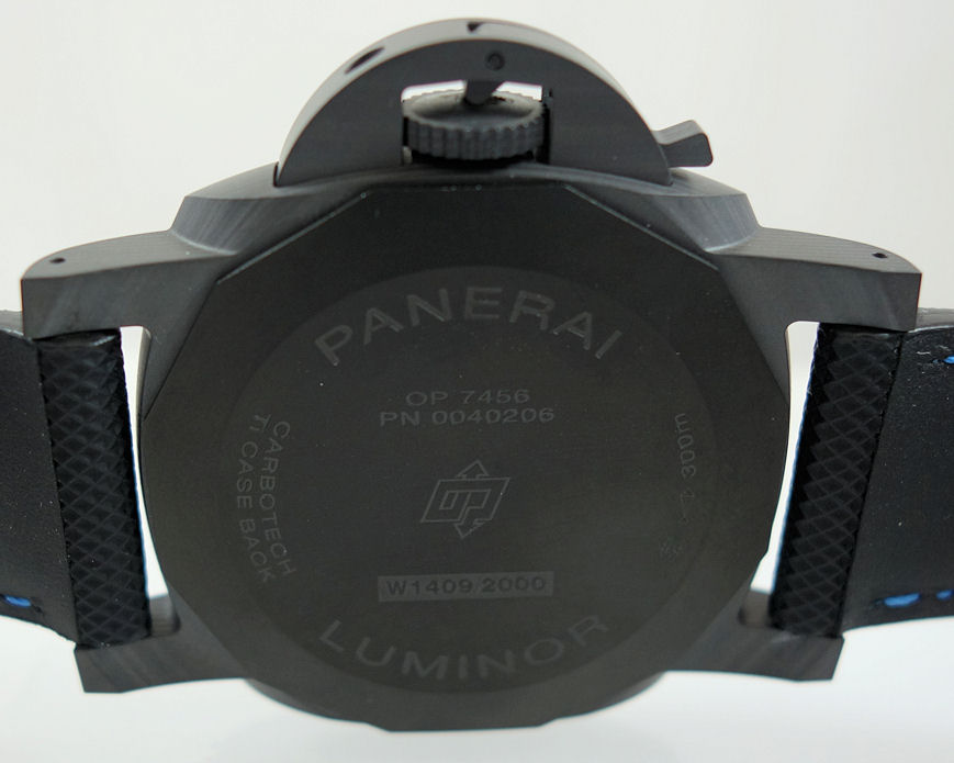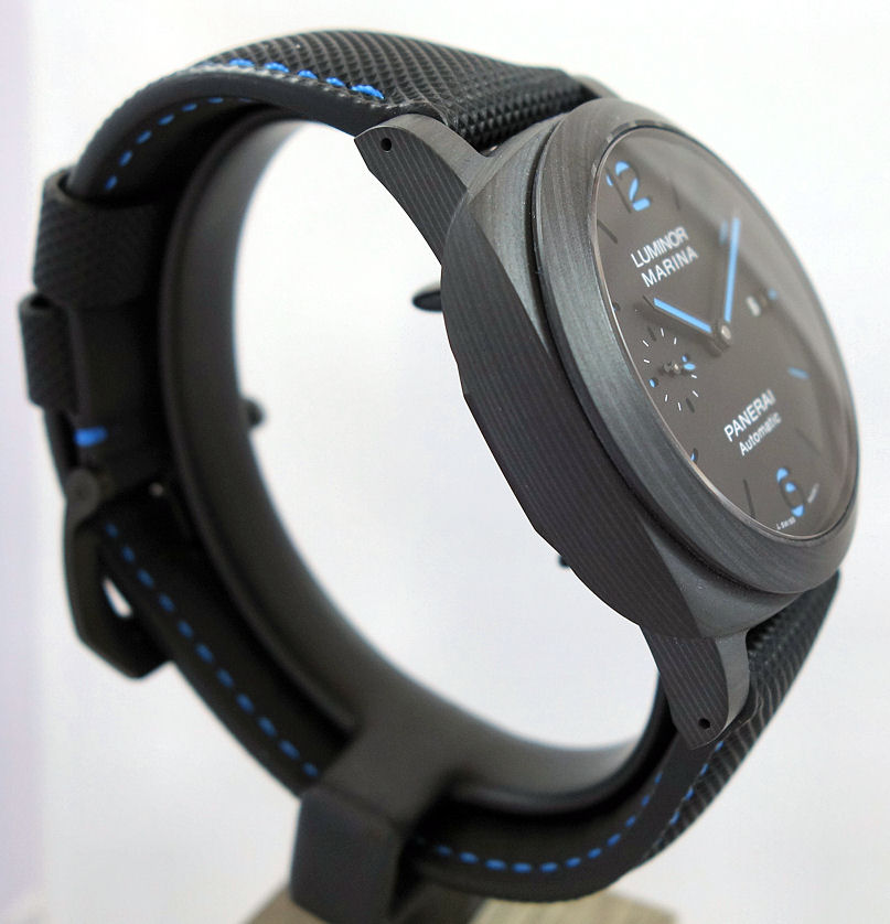 Black-Carbon 1950s Luminor case with Titanium back and crown-locking device. Sapphire crystal glass.