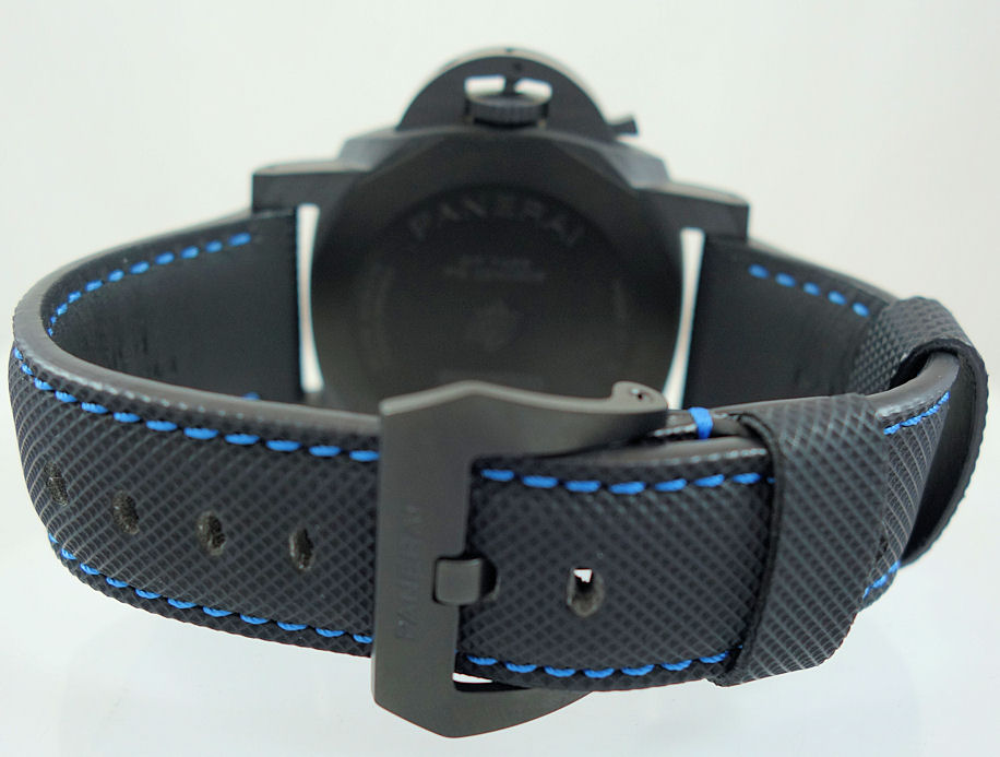 Sportech (rubber-like) black strap with blue stitching and leather lining. Panerai buckle in DLC-coated titanium.