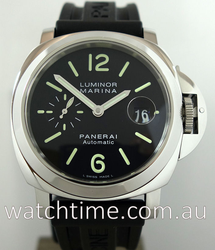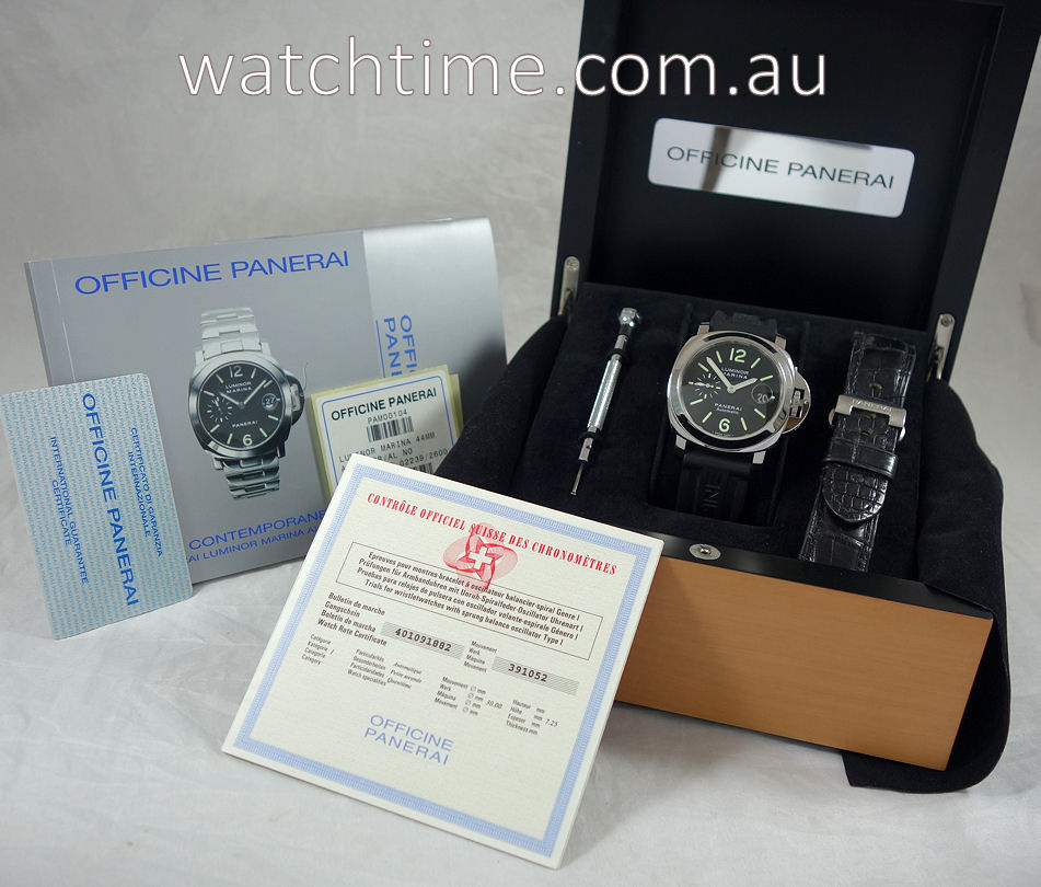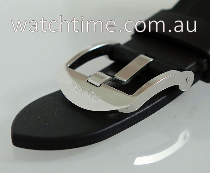 | Band | Black rubber strap with steel pin buckle by Panerai. Additional Black Croc-leather and steel deployment clasp. |