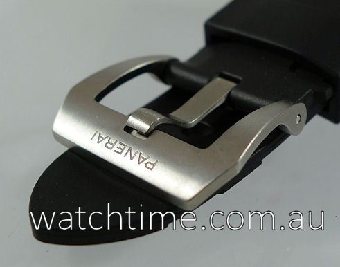 Black Panerai rubber with titanium pin buckle. Additional black leather with fitting tools.