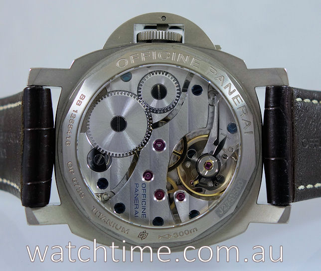 Brushed Titanium, Panerai crown-locking system, solid case-back and Sapphire crystal glass.