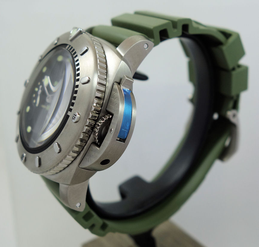 | Band | Khaki caoutchouc (rubber) strap with titanium buckle. Additional black rubber and black/brown leather straps. |