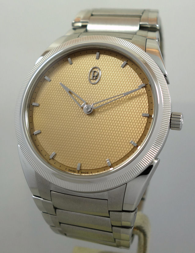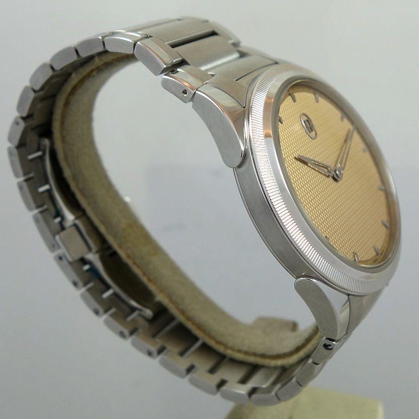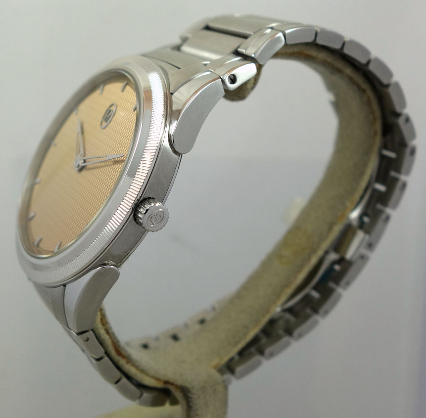 | Dial | Golden-Siena dial with Grain d’Orge hand-guilloché finishing. Delta-shaped hands with 18ct gold rhodium-plated applique hours. |