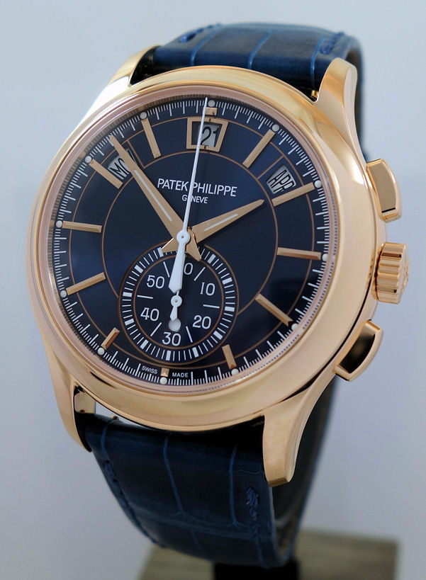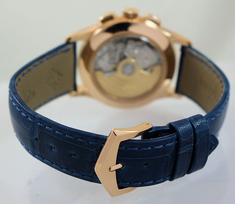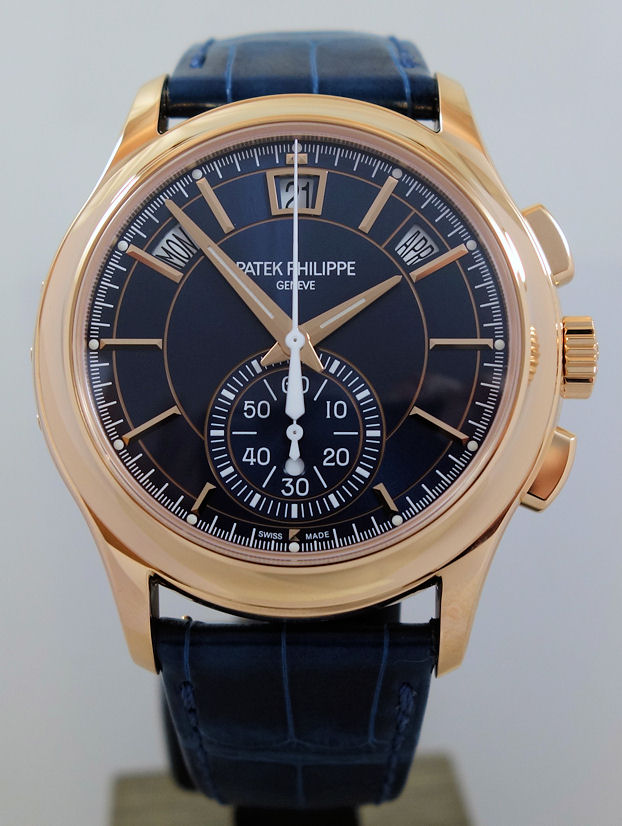 Sunburst blue with rose-gold faceted hour markers, luminescent dauphine hands. Annual Calendar indications displayed along an arc.