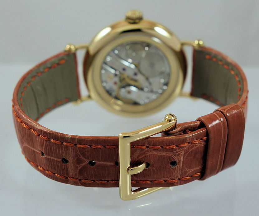Pearlescent with applied gold Arabic numerals, gold hands and sub-seconds / moon-phases above 6 o’clock.