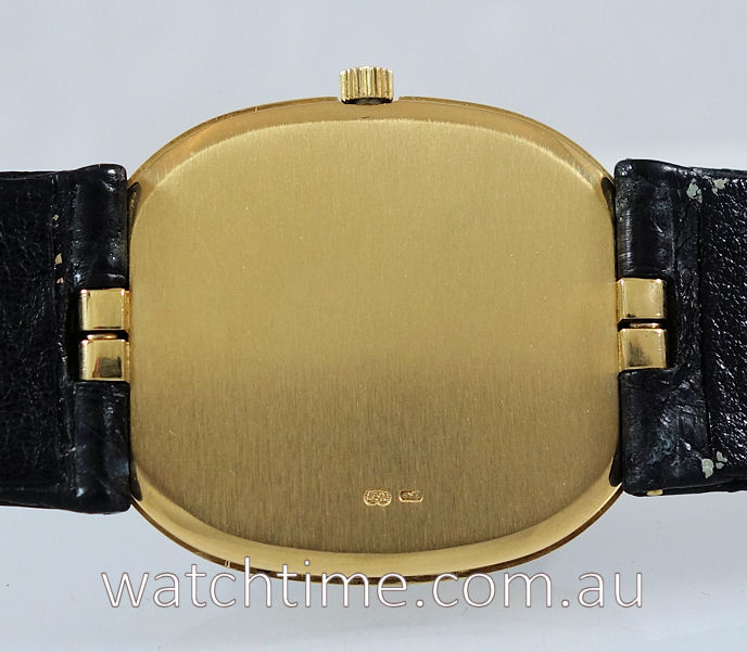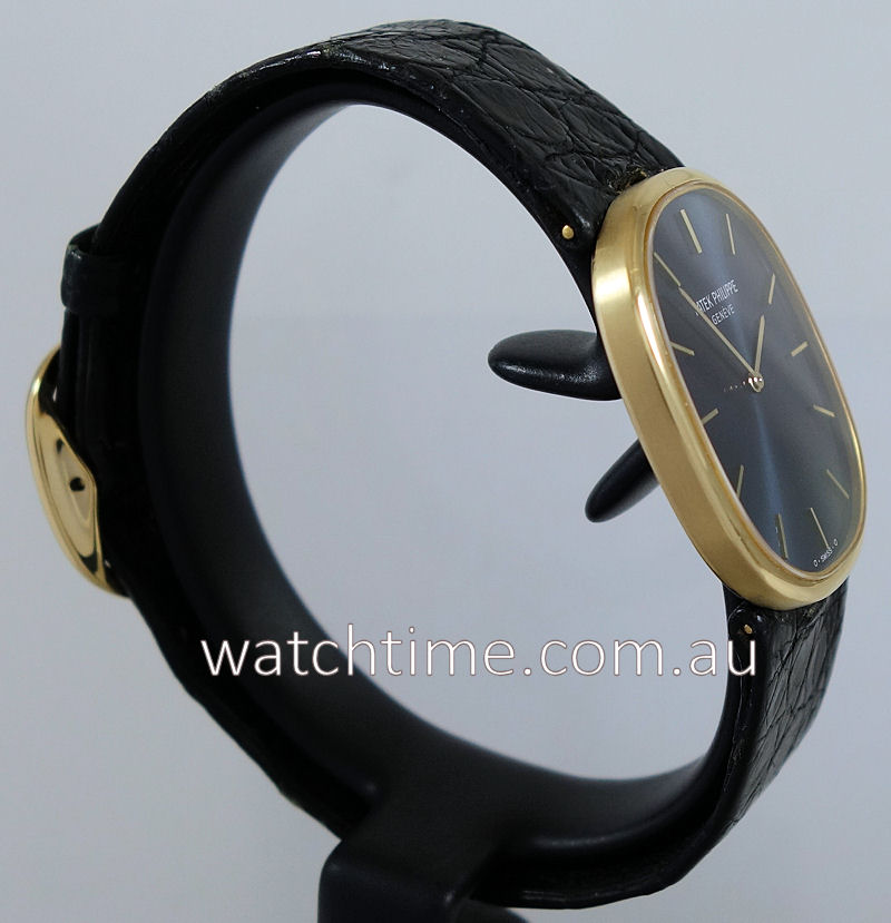 | Case | Polished 18k Yellow-Gold oval case with a slim curved bezel, concealed lugs and flat crystal glass. Winding crown bears the PP hallmark. |