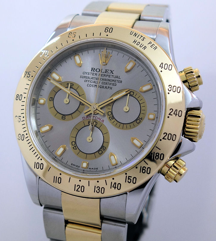 | Case | Stainless Steel Oyster case with 18k Yellow-Gold fixed tachymetre bezel. Sapphire crystal glass. |