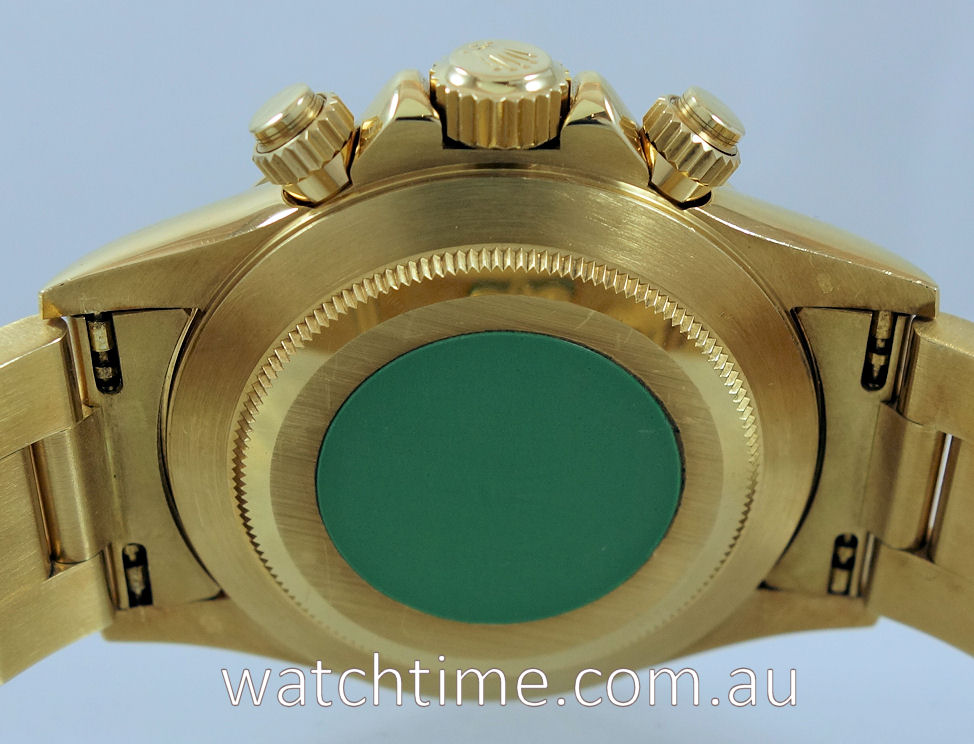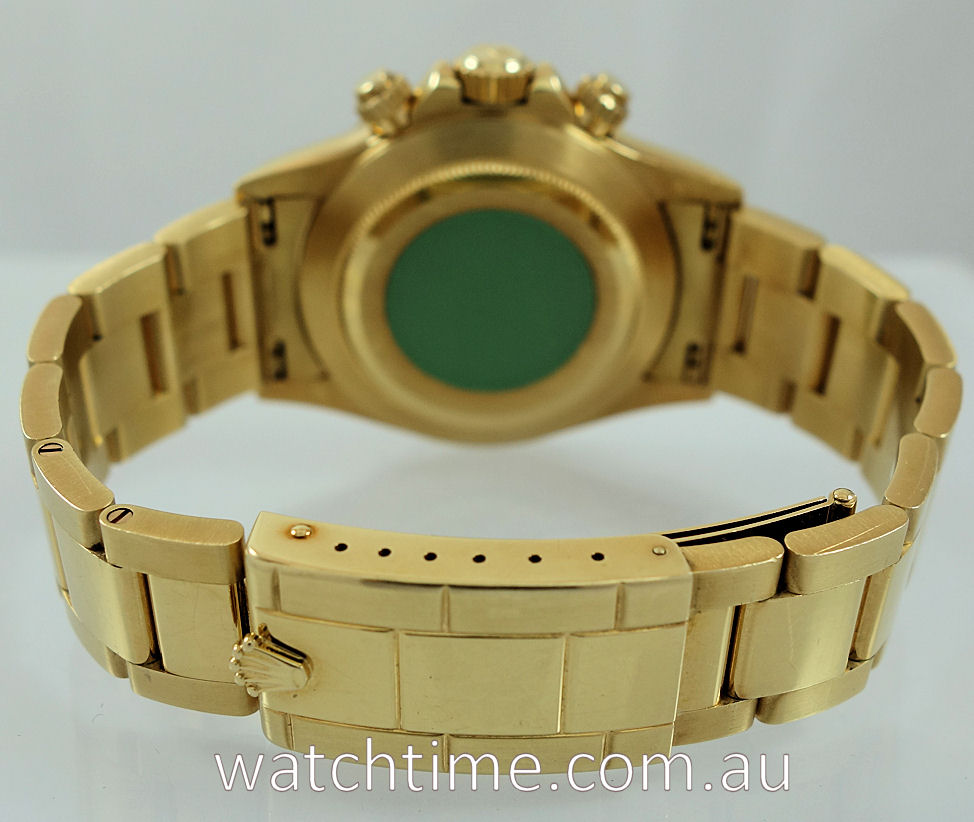 | Case | 18k Yellow Gold oyster case with screw-lock winding crown & pushers, bezel engraved with Tachymetre scale and Sapphire crystal glass. |