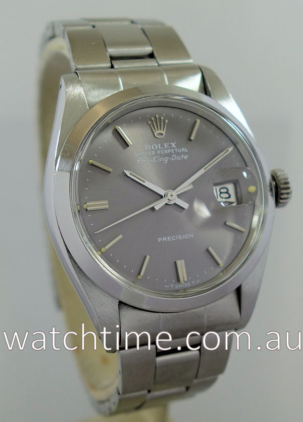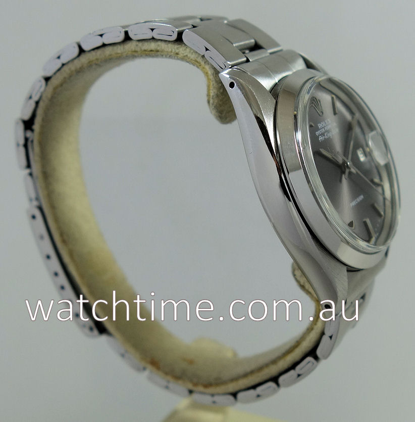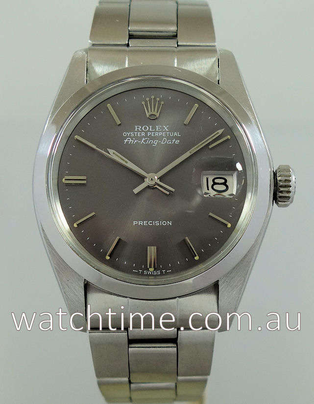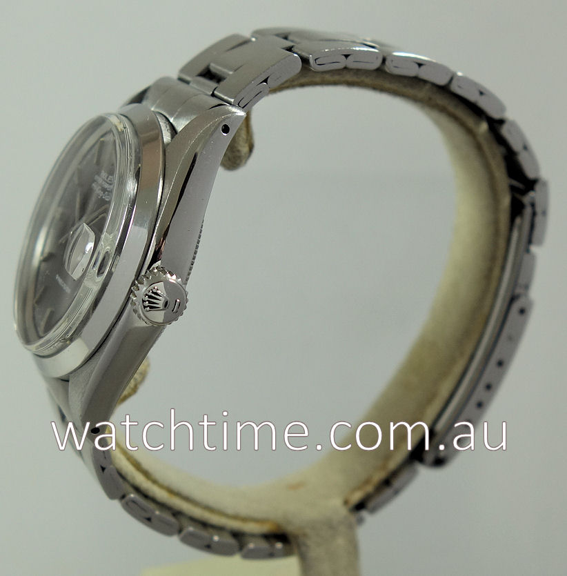 | Dial | Grey Sunburst dial with applied hour indices and matching hands. Date window at 3 o’clock. |
