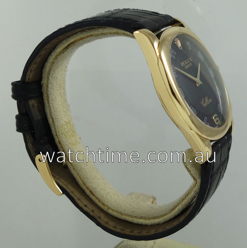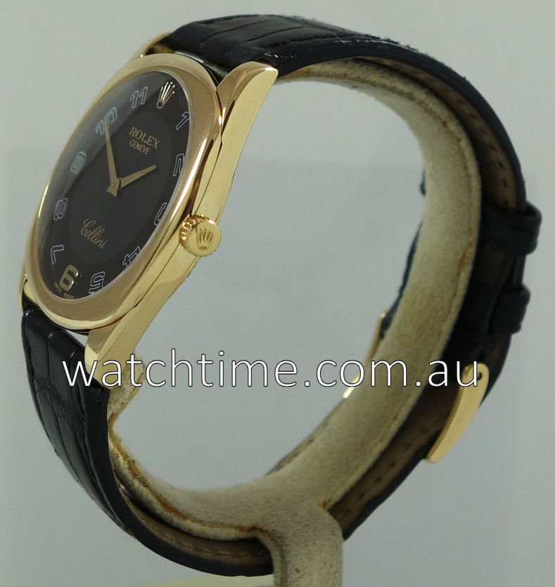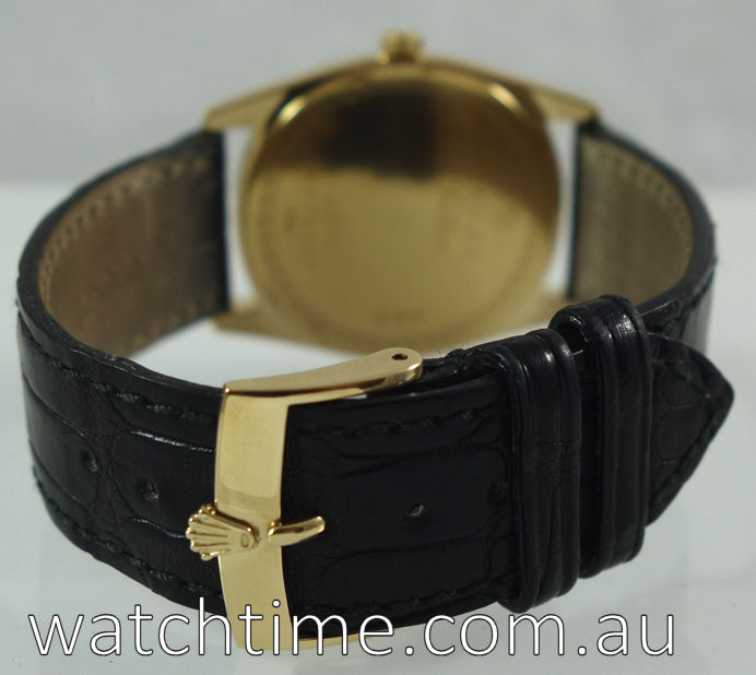 | Band | Black Alligator with 18k Yellow-Gold pin buckle by Rolex. |
