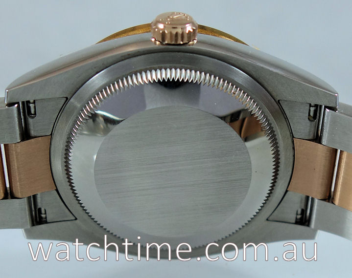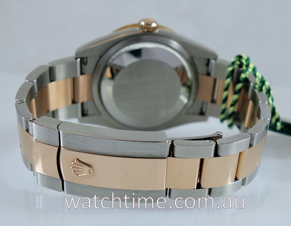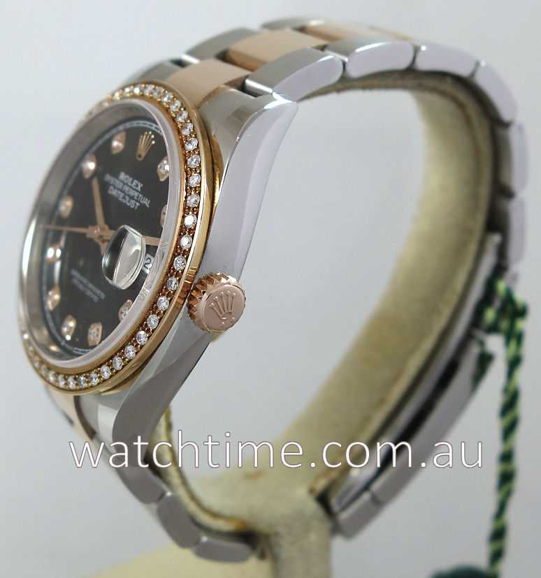 | Dial | Black with Diamond-hour markers and pink-gold hands. Date window at 3 h pos. |