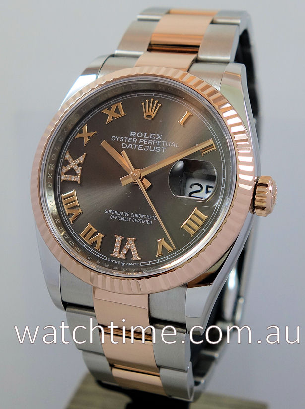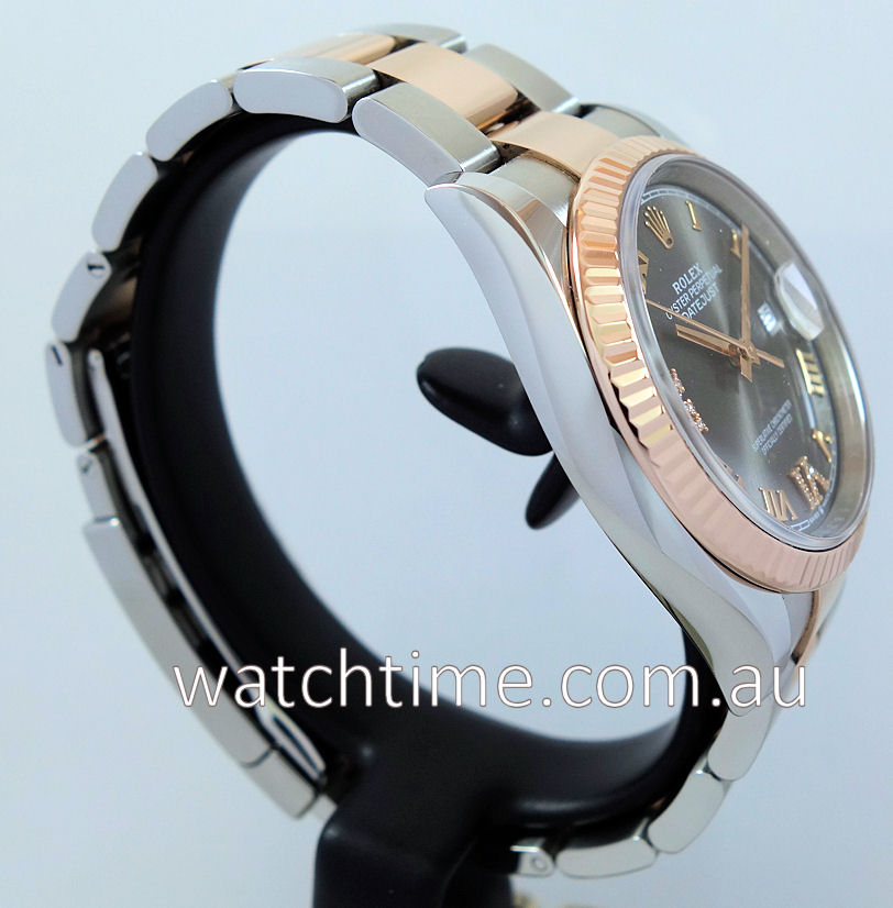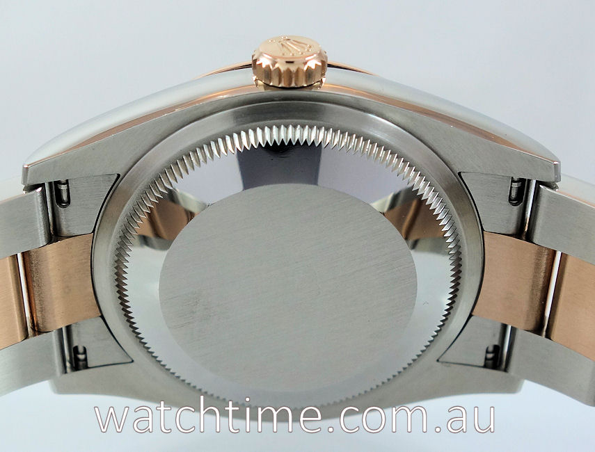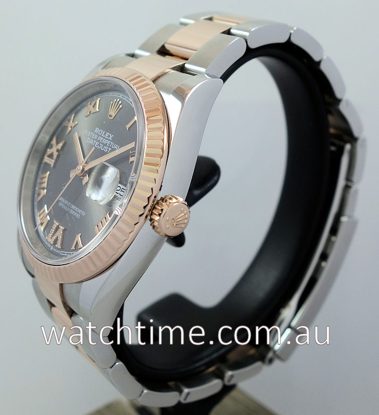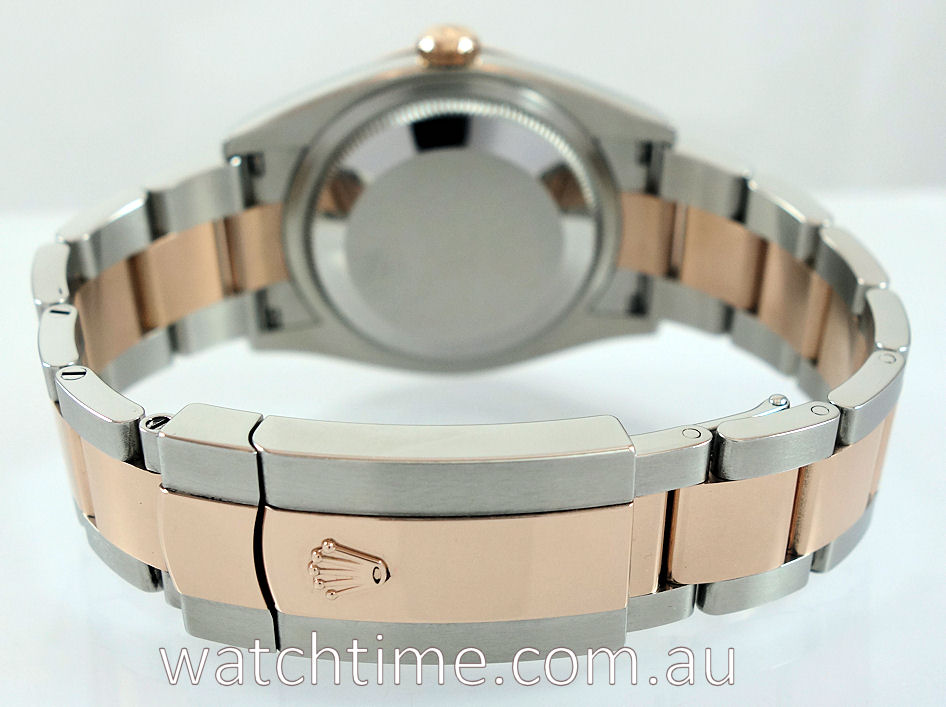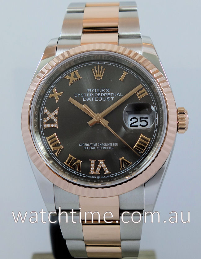 | Dial | Dark Rhodium with Diamond set (at 6 and 9) Rose-Gold Roman numerals and matching hands. Date window at 3 h pos. |