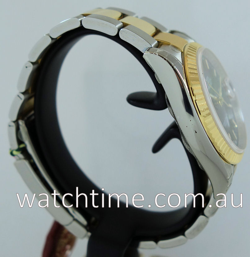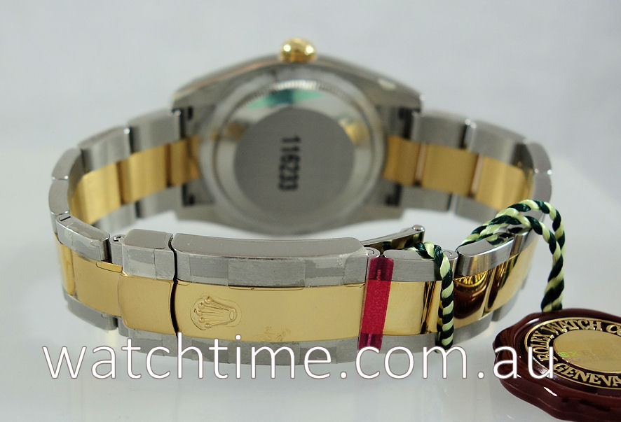| Case | Stainless-Steel Oyster case with 18k Yellow-Gold fluted bezel, screw-down crown and Sapphire crystal glass with cyclops over the date for magnification. |
