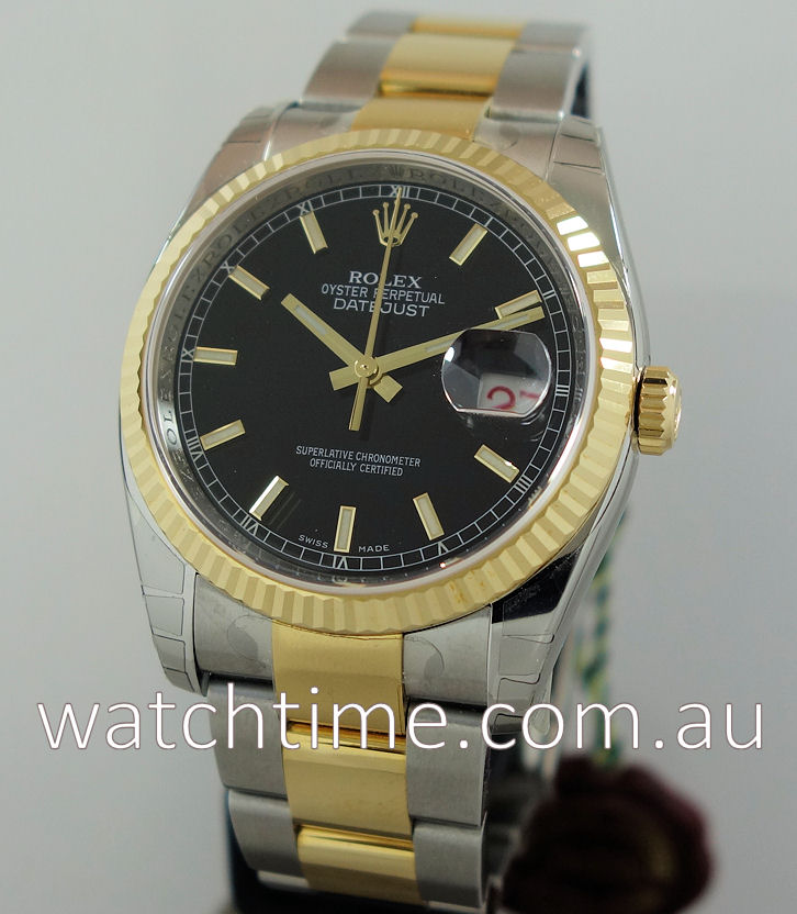 | Dial | Black dial with applied gold Roman numbers, matching gold hands and date window at 3 h pos. |