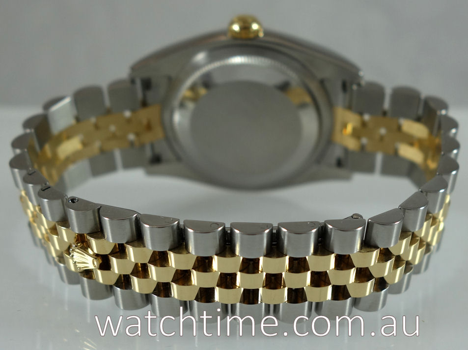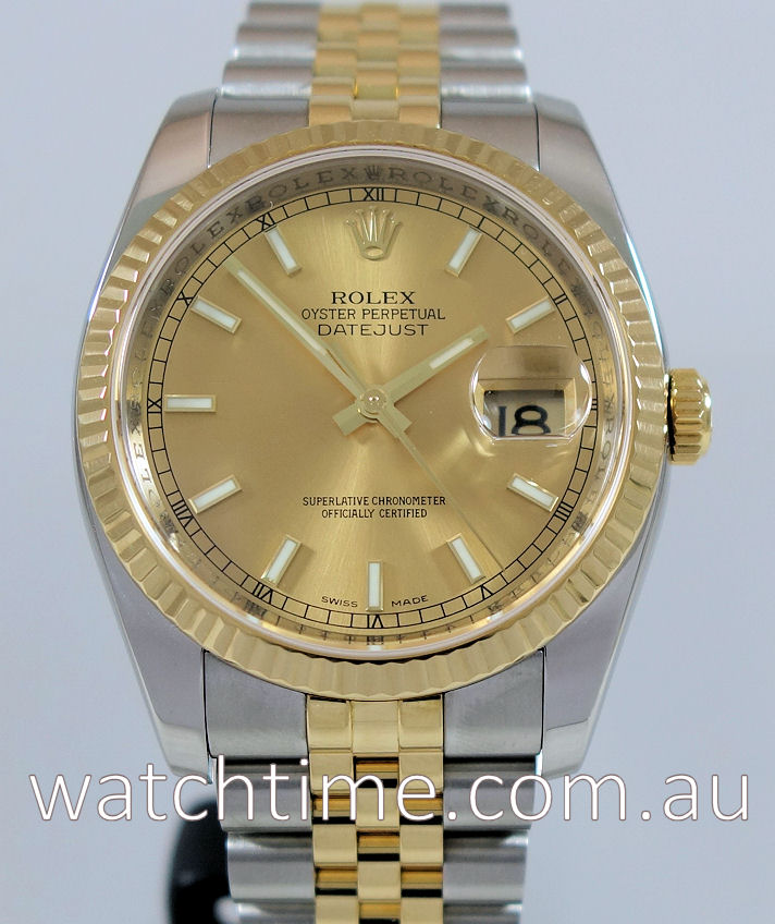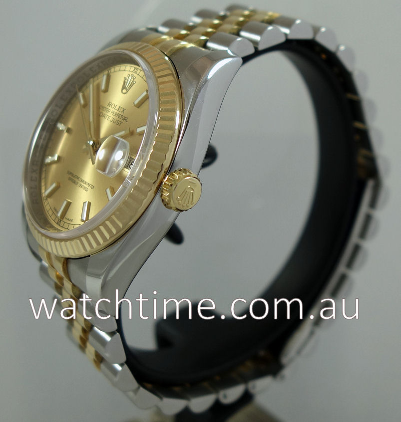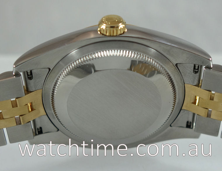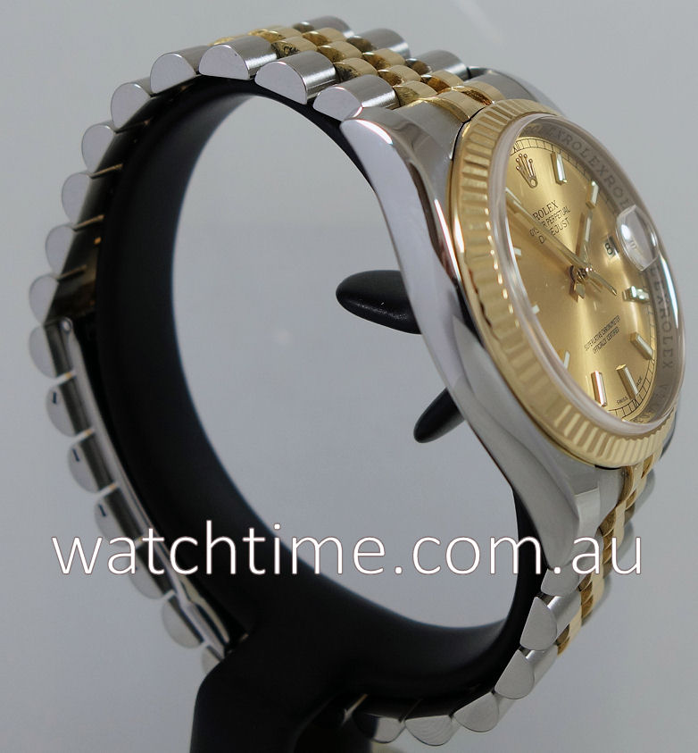 | Case | Stainless-Steel Oyster case with 18k Yellow-Gold fluted bezel, screw-down crown and Sapphire crystal glass with cyclops over the date for magnification. |