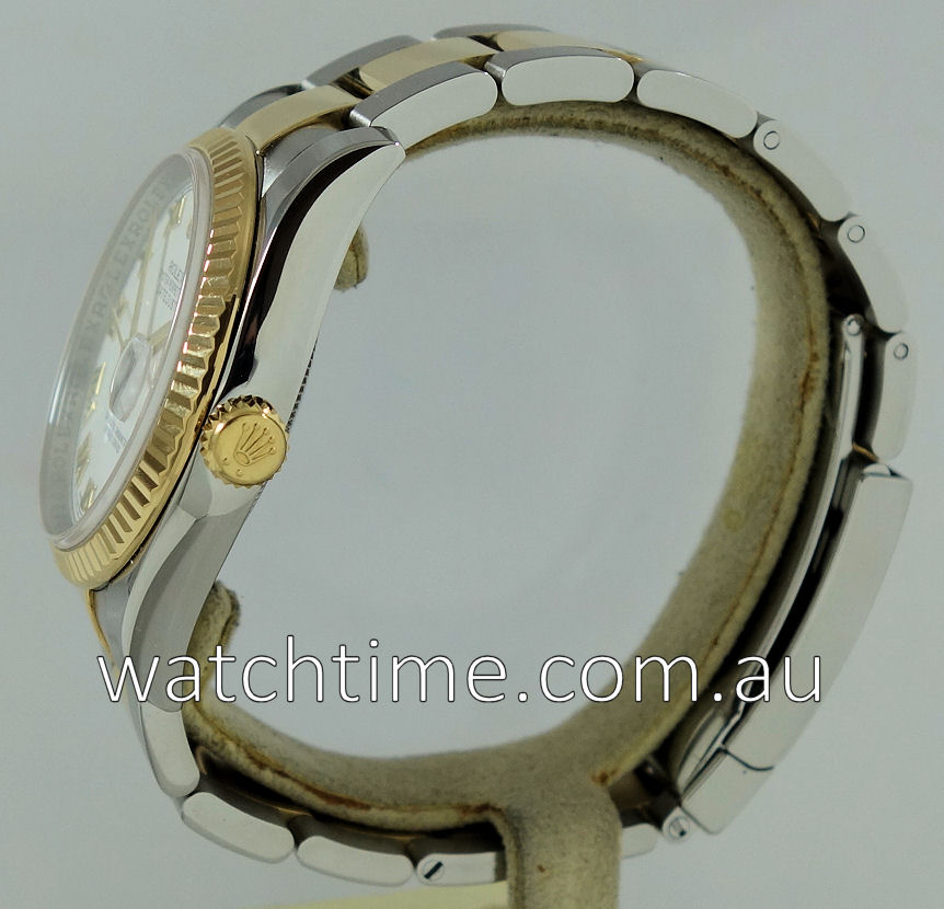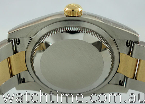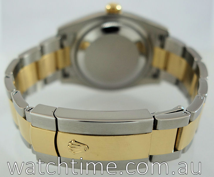 | Case | Stainless-Steel Oyster case with 18k Yellow-Gold fluted bezel, screw-down crown and Sapphire crystal glass with cyclops over the date for magnification. |