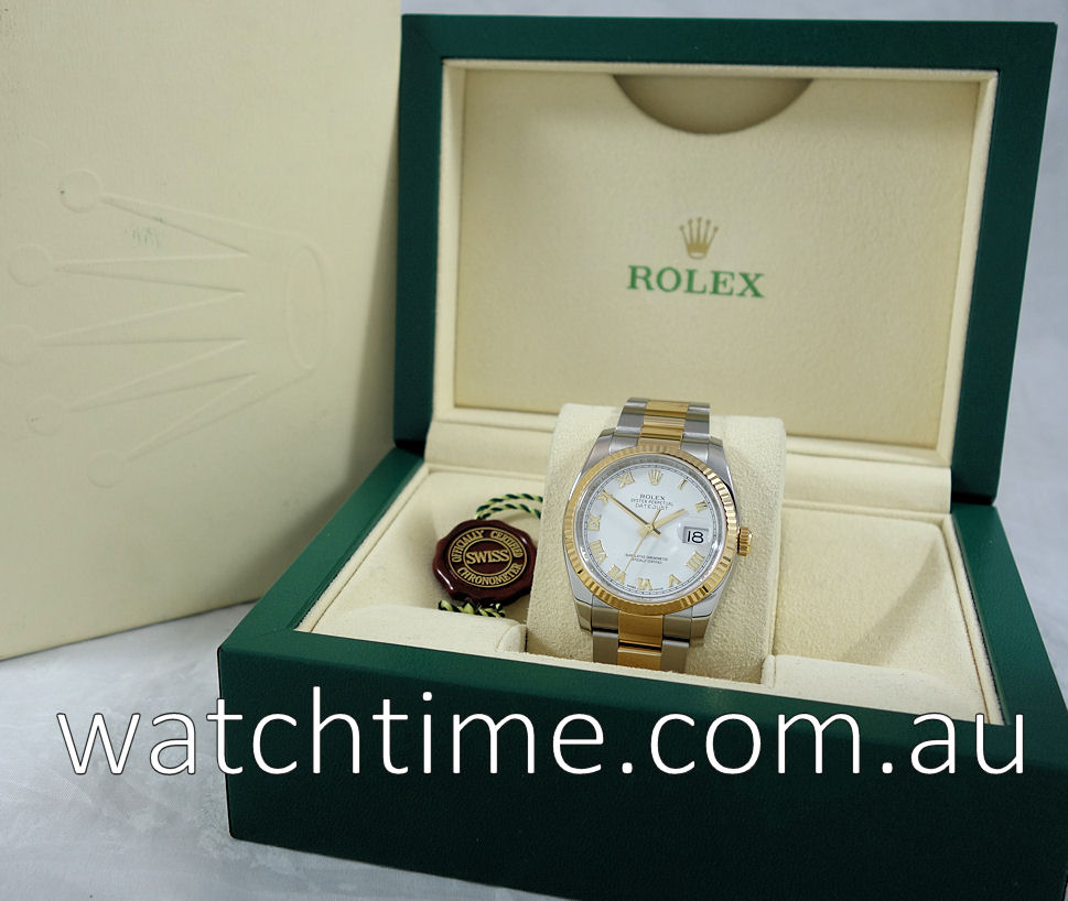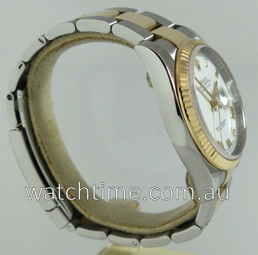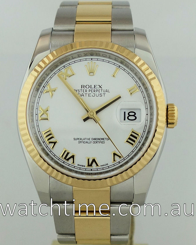 | Dial | White dial with applied gold Roman numbers, matching gold hands and date window at 3 h pos. |
