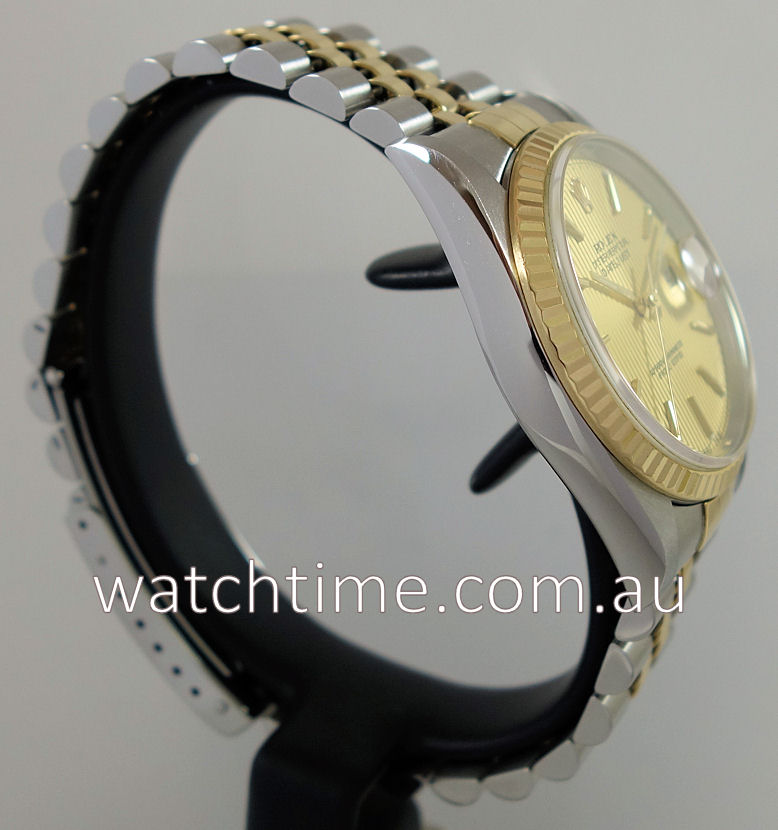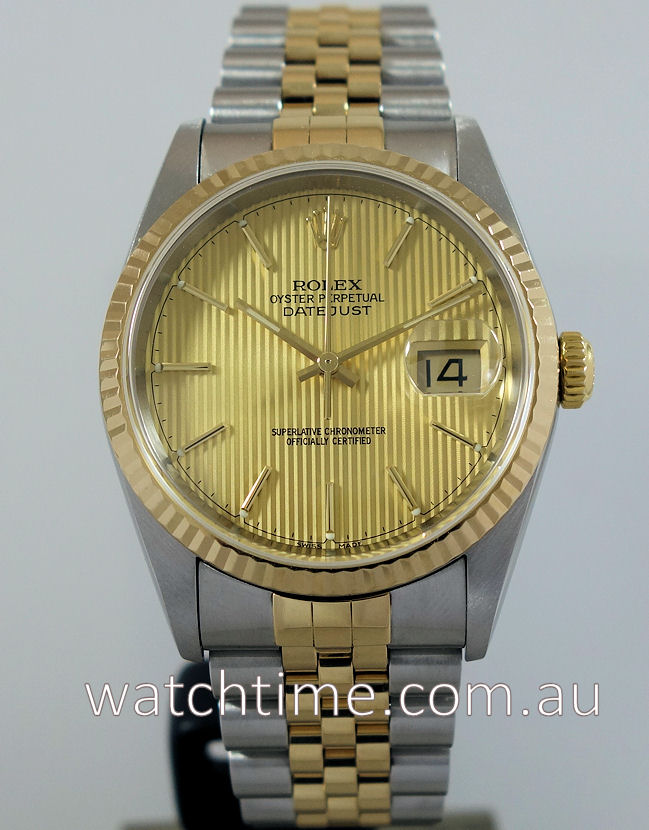 | Dial | Champagne “Tuxedo” dial with vertical stripes, Gold hands and date window at 3 h pos. |
