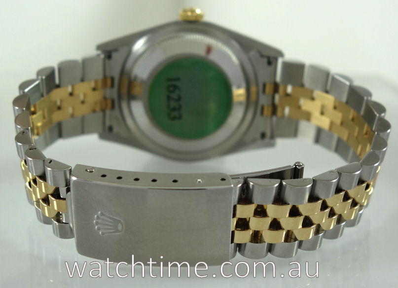 | Case | Stainless-Steel Oyster case with 18k Yellow-Gold fluted bezel, screw-down crown and Sapphire crystal glass with cyclops over the date for magnification. |