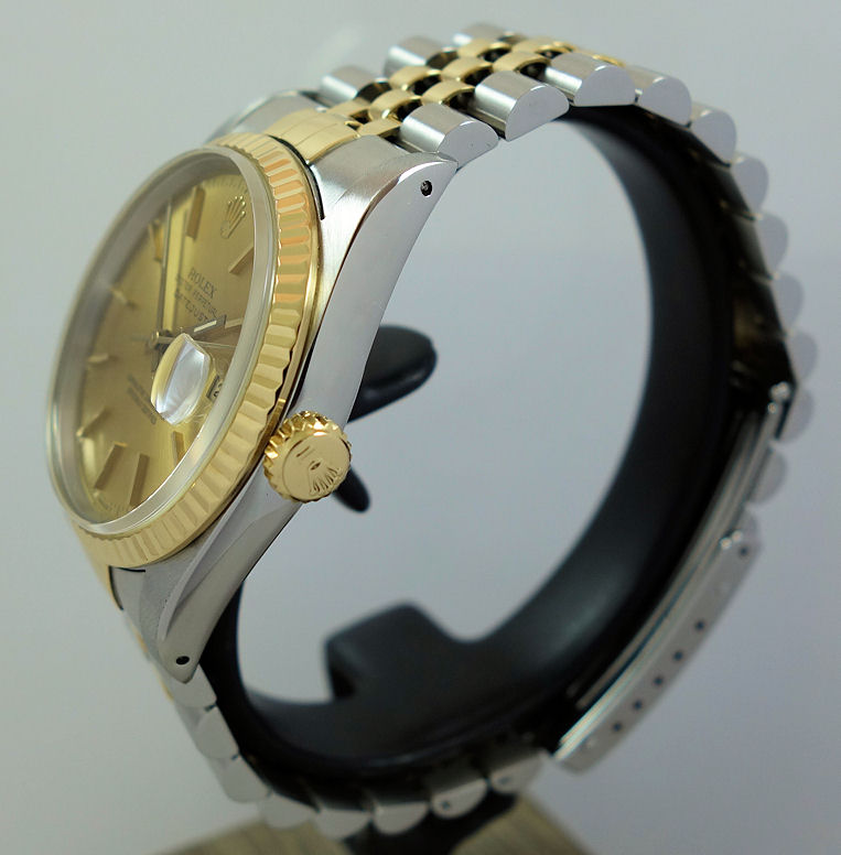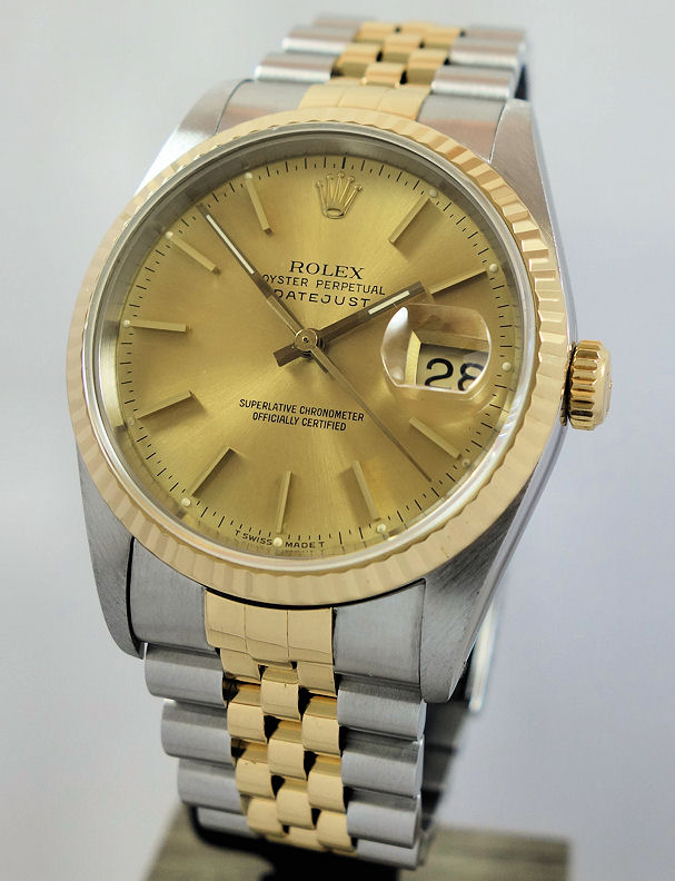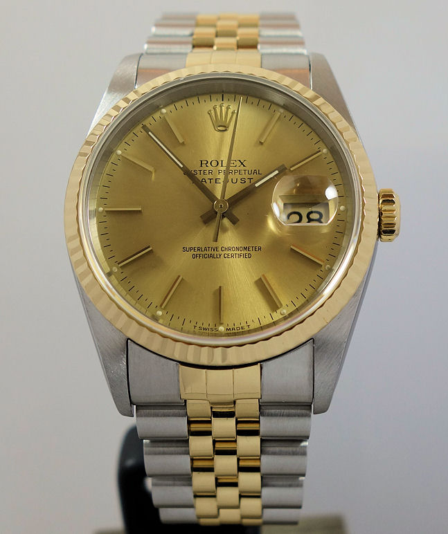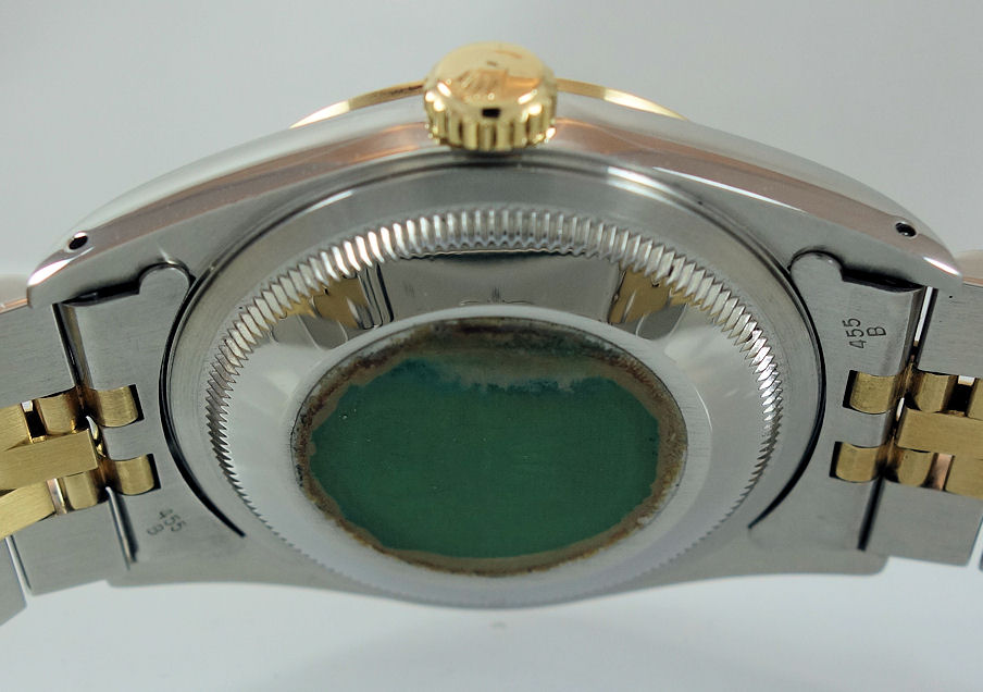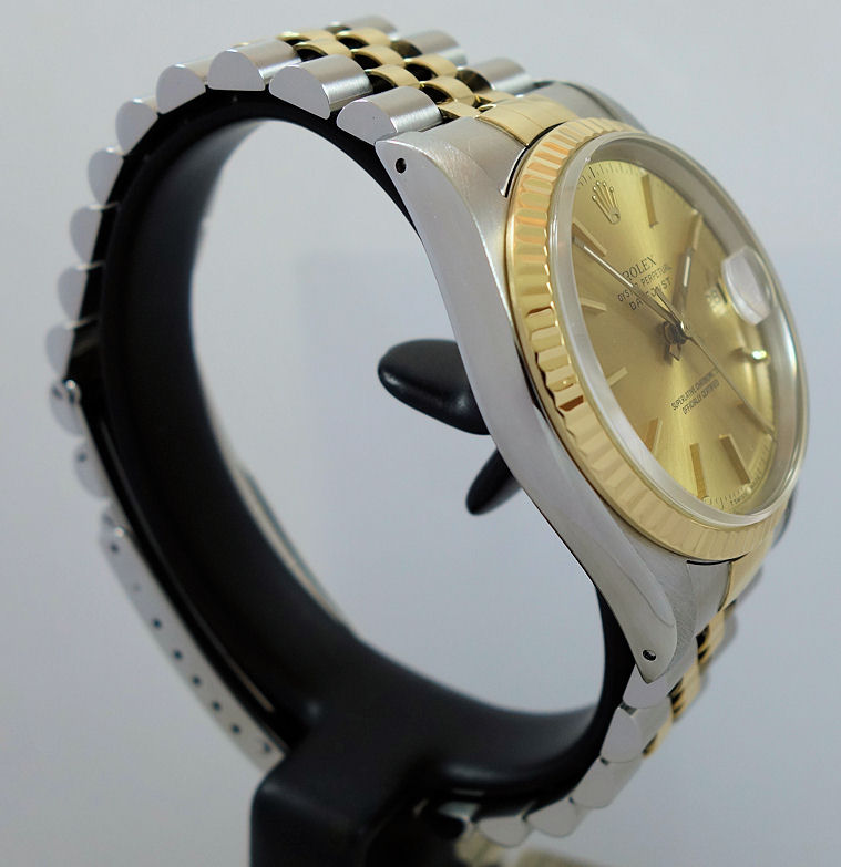 | Case | Stainless-Steel Oyster case with 18k Yellow-Gold fluted bezel, screw-down crown and Sapphire crystal glass with cyclops over the date for magnification. |