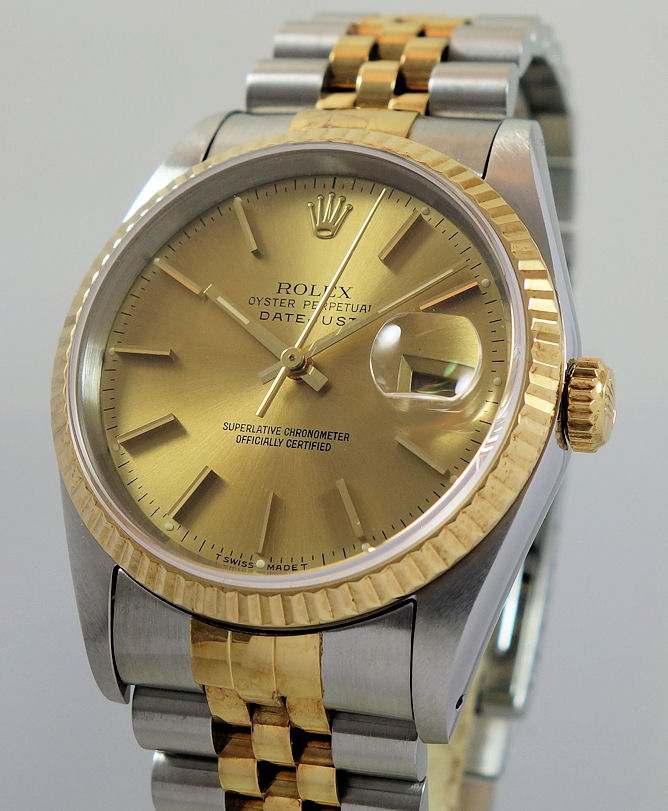 | Case | Stainless-Steel Oyster case with 18k Yellow-Gold fluted bezel, screw-down crown and Sapphire crystal glass with cyclops over the date for magnification. |