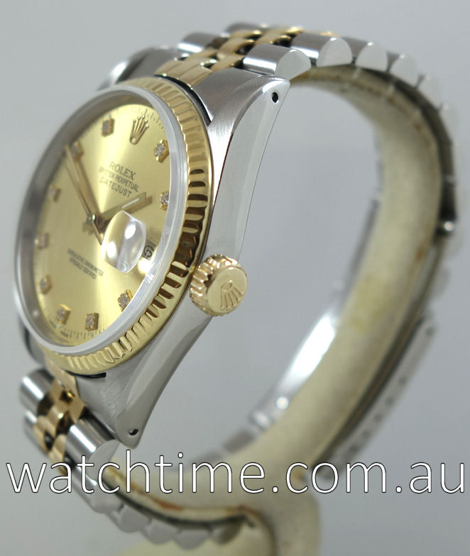 | Dial | Champagne dial with Diamond-hour markers, Gold hands and date window at 3 h pos. |
