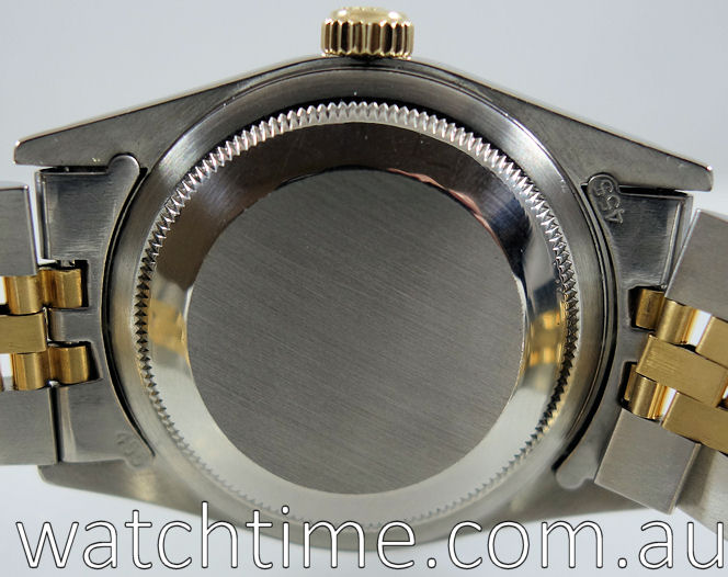 | Case | Stainless-Steel Oyster case with 18k Yellow-Gold fluted bezel, screw-down crown and Sapphire crystal glass with cyclops over the date for magnification. |