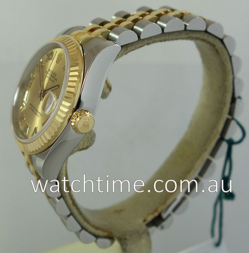 | Dial | Gold sunburst dial with applied black / gold Roman numerals and matching gold hands. Date at 3 h pos. |